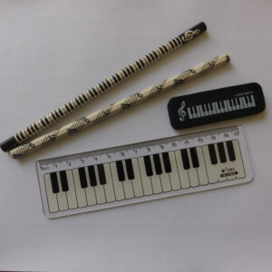 Schrijfgerei bestaande uit 2 potloden, een gum en een liniaal met muziekmotief. Kijk ook eens naar een leuke etui.
